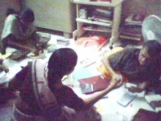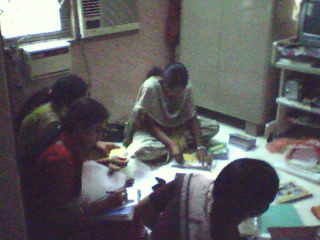 Our student flow continues on Saturdays and 4 new students were inducted with good sponsorship. Aishwarya M.'s (9th grade) father died recently and her was mother was forced to take up a cooking job. Maithri came to her rescue with the help of a generous sponsor paying her entire year fees of nearly Rs.11,000. She shows good interest in Bharthanatyam and encouraged by Maithri and her sponsor. Photos of Trustees and Volunteers filling applications, cards and disbursing fees.