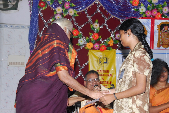 June 2010We are pleased to welcome the successfully tenth-standard passed students by giving away prizes for the meritorious students. To prepare them for the forthcoming board exams, Senor students prepared mock-question papers to each one of the junior students and corrected the answer sheets. This was done in a real professional style by these interested students. May 2010Maithri is very pleased and happy that all 12th standard students passed with high marks and ready to go over to degree courses, Mr. Subramaniam, patron of Maithri, gave away cash prizes of Rs.500/- for M.Ganesh for scoring highest mark among our students and Rs.250/ for 6 other students with a "Tirukkural" book for each one. 60 students were paid fees this month, which is almost four times in number from what we paid in April 2009. 4 young students from Maithri took part in a summer camp and not only tasted success in studies but also in sports and games, fine arts, internet, and drama competitions with other students from various city schools. April 2010April normally, a pensive month for students - as they await their examination results/marks and graduation to next grade, but this year has turned out to be very different We had a big event on the 10th of this month - 'MAITHRI's DAY OUT.' Maithri students devised cultural programs with songs, dances, drama-skits etc.,. This was an informal function where the students took all the initiatives and Ms. Sangamitra Amudha, Mr. Raviraj Munusamy of Kalanjiyum trust and Mr.Shivakumar (Donor) participated with the parents, donors, well wishers, alumni of Maithri. About 30 students and staff from Kalanjiyum Trust from villages near Madhuranthagam district participated in this event. Best Student Award (Boy) named after late Mr. S.Seshadri, an ardent supporter of Maithri from its early days and Best Student Award (Girl) named after Ms. Sita, a widow at her young age, helped other families by working as a cook until her late years (89) were initiated during this occasion. Keshav Prasad who scored high marks in the 12th grade and presently enrolled in ICWA and Aishwarya who scored high marks in her 10th grade were the recipients of these awards (a gift cheque valued for Rs.1000) (see pictures below).