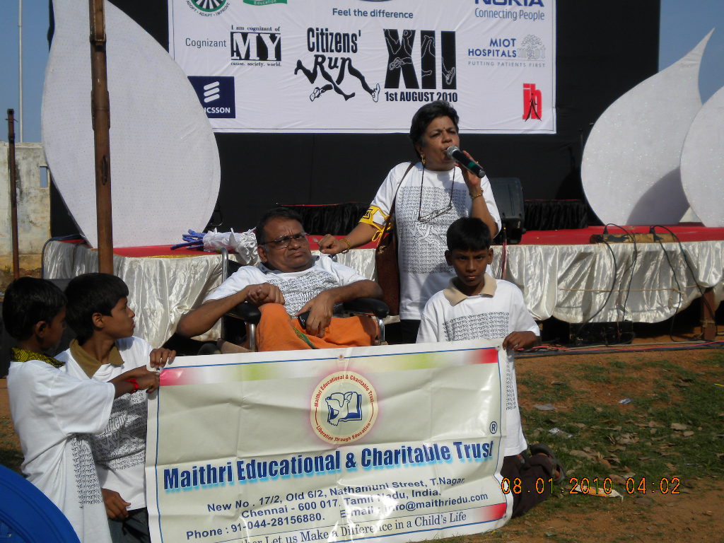 September 2010Maithri celebrated "Teacher's Day" on 6th of September. Students honored Mrs. Rajalakshmi and Mr. Subramanian by presenting shawls and also spoke on the valued guidance provided by the two. Further, each student delivered a small speech about Dr. Radhakrishnan, (whose birthday-5th Sep is celebrated as Teacher's Day) as a teacher and the first President of the Republic of India. The function ended with birthday cake being cut and relished by one and all. On the very same day, Maithri Shreedhar was invited as a guest speaker in the teacher's day celebration held in Queen Maris College hostel. Sanmarga Foundation Founder, Ms Sangamitra Amuda gave the introductory remarks and Shreedhar answered some of the inmate's questions. On 24th Maithri's three months' training camp for sex workers came to an end. A valedictory function in Santhome Vigilance Home was conducted. The IAS Officer from the Department of Social Welfare Board Government Of Tamilnadu presided over the function and distributed the sheilds to all the trainers and certificates to the students. Ms. Reshma Sharma spear-headed this training camp and made it a huge success. Early this month, Miss. Prema, daughter of a fisherman, who had obtained very good grades in her B.E.(Bachelor of Engineering) was selected for M.E. course. The request came from another NGO on behalf of Prema, to share a portion of her fees. Based on her financial and family condition, Maithri shared one third of her fees. See special column for stories of Girija and Meena. August 2010On the first of August, 25 students along with the Founder Trustee of Maithri took part in CITIZENS' RUN (2010). All of them wore special T-shirts and ran the stretch along the Marina beach and arrived at the starting point: Lady Wellington College. Each and everyone who took part enjoyed this annual run for "the noble cause". (see pictures) On 7th August, the Founder Trustee was invited to "The College Students and Graduates Association of the Blind" where, he was thanked for the services rendered to the Visually Impaired Students for the past 20 years. Reading and running an audio cassette library were some of the services offered. On 15th August, Independence Day was celebrated by Maithri with National Flag Hoisting, students speech on "youth and independence" and distribution of sweets and other eatables. On 21st August, nineteen girl students were offered special medical checkup by Dr. Geetha Arjun. Free medicines were offered for the students and three of them were called back to undergo special treatment. Maithri will be doing the follow up. Special thanks to ASEEMA TRUST for making all the arrangements. Tameembabu, a college student has proved that he can "earn while learning". He was doing a part-time small business of supplying drinking water cans to residentential houses and set a trend that if you are ready to work, means and opportunities will present itself. MAITHRI provided him loan for investment for this business as part our "micro financing scheme". The scheme provides easy monthly return of the loan and MAITHRI has initiated loan for two promising students per year. |