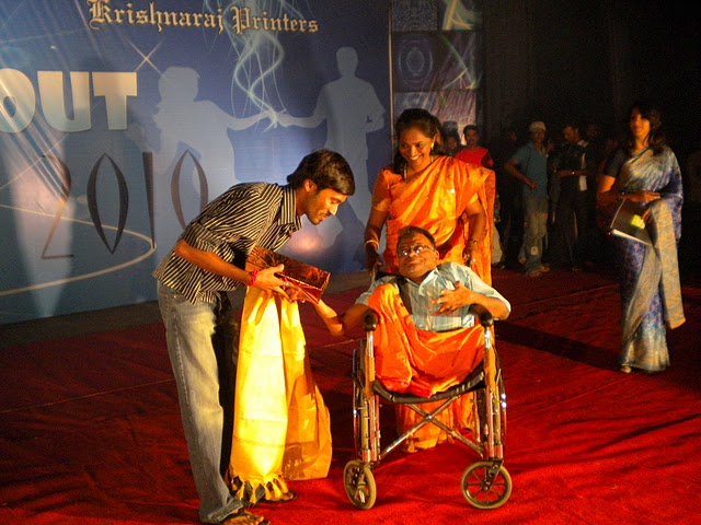 On Feb 13th, Maithri's Founder/Trustee Mr. Shreedhar was invited by ARUWEE (an organization catering towards home for destitute elders and deprived children) for their tenth anniversary program in Kamarajar Arangam, Chennai. Shreedhar was asked to give away Certificates for social work to students from various city colleges. Shreedhar was also requested to welcome the chief guest, cine-actor, Dhanush.