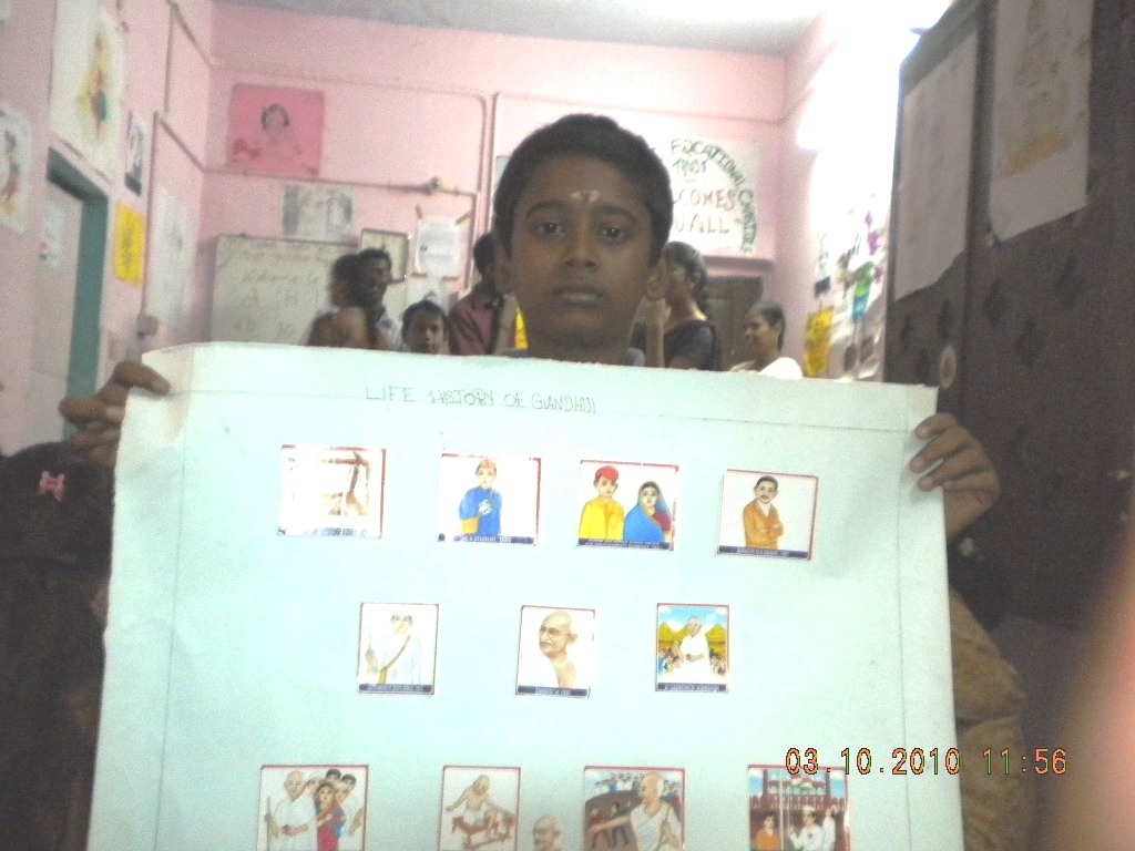 October 2010This month an article on the Founder/Trustee of Maithri appeared in the monthly magazine "Frozen Thoughts" and was greatly appreciated by many. (See scanned article) Gandhi Jayanthi (Oct. 2) was celebrated in great fervor by Maithri students. A Quiz on the Father of the Nation, Gandhiji was devised by Ms. Swetha and conducted along with Ms. Shyamala (Maithri student) and the student participants responded actively and knowledgably. The best student received a prize - a book on Gandhiji and young students drew pictures of the Mahatma and his life. (See pictures below) |