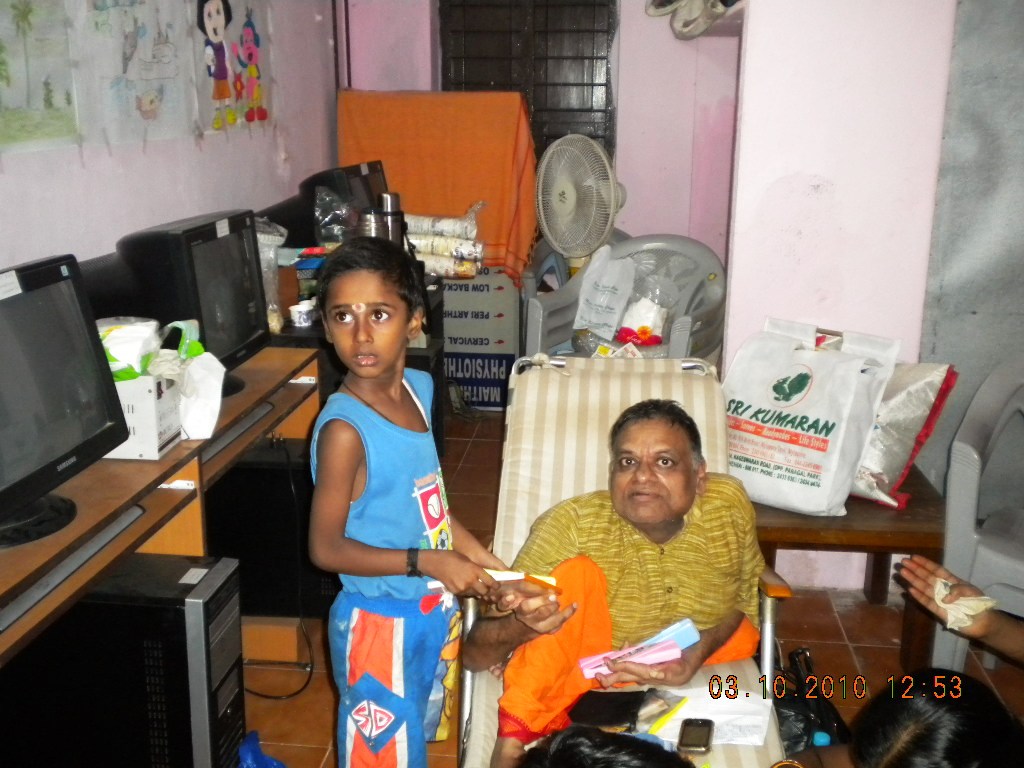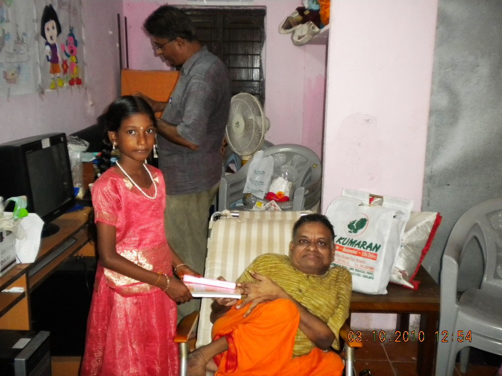 July 2010Maithri thanks Sukrithi Social Foundation for placing three more computers in Maithri office for the students' benefits. Maithri also thanks Mr. Chandrasekar of SAMA Engineering Pvt. Ltd. for providing college text-books worth Rs. 10,000/-. We are indebted to Mr.Narasimhan who had been instrumental for this noble gesture. Mrs. Shobana Surjitkumar of California, USA celebrated her son's birthday by sending boxes with snacks and icecream for Maithri students on 18th July. On July 30, Maithri team (consisting of Mrs., Praveena, Reshma and Rajalakshmi with the Founder trustee) visited Kalanjyum Trust in the outskirts of Chennai and distributed this academic years' fees for 22 students under 'Rural Education Project' programme (pictures). Maithri congratulates Ms. Sowmya Simhan, founder of Sukrithi Social Foundation and one of Maithri trustee for getting the coveted Asendes BEST WOMAN SOCIAL WORKER 2010 award constituted by The Tamilnadu Federation of the Differentlyabled. |