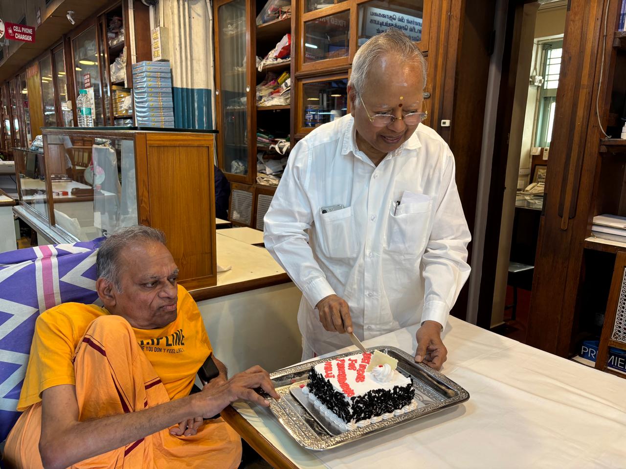 Maithri's trustee Mr Sreedhar congratulating Dr Nalli Chinnaswamy Chetty for being awarded Padmashri.